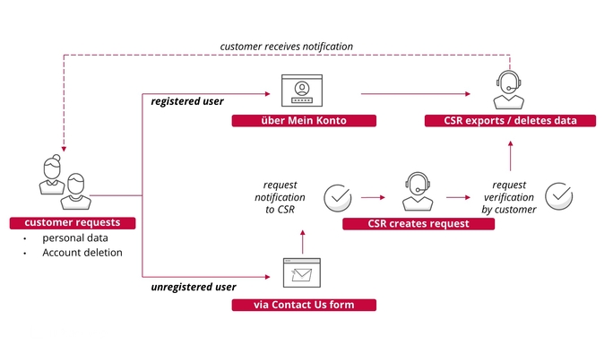 Regarding possible customer requests we considered the relevant aspects and implemented features to realize a fast export and deletion of all personal data, which was collected within the ICM. A customer can request her or his personal data or the account deletion either as a registered user via the My Account section or as an unregistered user via the Contact Us form.